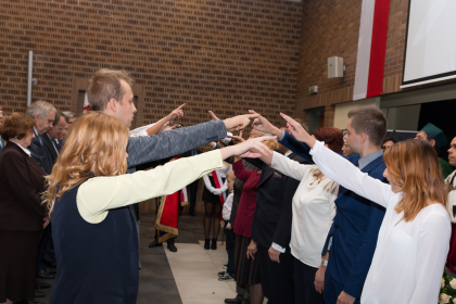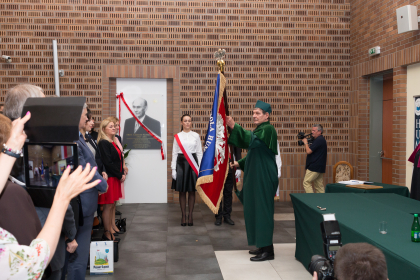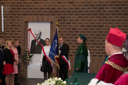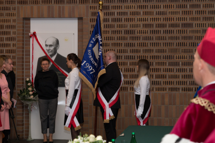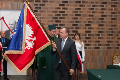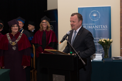 Wyjątkowym punktem wtorkowej uroczystości był akt przekazania sztandaru Wyższej Szkole Humanitas przez Arkadiusza Chęcińskiego, Prezydenta Miasta Sosnowca.