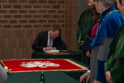 - Niniejszym uroczystym aktem przekazuje sztandar jako symbol najwyższych wartości, honoru i tradycji oraz zobowiązanie do godnego wypełniania akademickiej misji. Chlubne tradycje Wyższej Szkoły Humanitas są powodem do zasłużonej dumy, ale też zobowiązaniem do kontynuowania dzieła dydaktycznego zainicjowanego w 1997 roku z chwilą utworzenia Uczelni – odczytał treść aktu Prezydent Arkadiusz Chęciński, po czym dokonał wbicia gwoździa honorowego w drzewiec sztandaru i złożył wpis w księdze pamiątkowej.