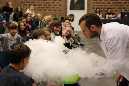 Uczestnicy konkursu jak i zebrani goście wzięli też udział w wyjątkowym pokazie magicznych sztuczek łączącym w sobie w efektowny sposób tajniki chemii i fizyki.