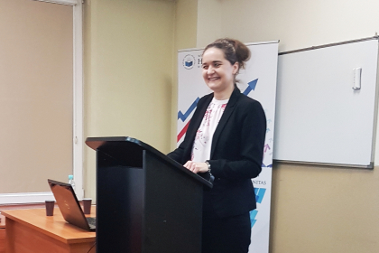 Niezwykle interesujący referat wprowadzający do dyskusji, na temat „Analiza instytucjonalna ustawy z dnia 8 grudnia 2017 r. o zmianie ustawy o drogach publicznych oraz niektórych innych ustaw w zakresie art. 4 pkt 8 nowelizującego art. 77 ustawy o transporcie drogowym”, wygłosiła niedawna absolwentka WSH (kierunek: Prawo) mgr Ewa Mazelanik – laureatka I miejsca ogólnopolskiego konkursu na prace badawcze „Wykładnia prawa jako pochodna rozumienia celu i sposobu działania – edycja 2017/2018”, w kategorii: Praca magisterska.