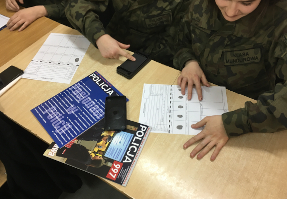 Uczestnicy zapoznali się także z pracą policjanta oraz poznali procedury naboru do tego zawodu. Kierownik CKSM WSH przedstawił niektóre sposoby zabezpieczania śladów kryminalistycznych, w tym: daktyloskopijnych, biologicznych, chemicznych, mechanoskopijnych i traseologicznych. Uczniów bardzo interesowała omawiana tematyka, czego dowodem było zadawanie dociekliwych pytań, na które prowadzący udzielał wyczerpujących odpowiedzi. Sala ćwiczeniowa zamieniła się w policyjne laboratorium, w którym uczniowie mogli sami ściągnąć odciski linii papilarnych z szyb okna, drzwi oraz innych przedmiotów i nanieść na folię daktyloskopijną. Sami również pobrali swoje odciski linii papilarnych do porównania na specjalnej karcie. Zajęcia spotkały się z bardzo pozytywnym odbiorem młodzieży i wywarły na nich spore wrażenie. Pojawiło się również wiele pytań na temat służby w Policji i jak można się do niej dostać, ponieważ w przyszłości chcieliby w niej służyć.