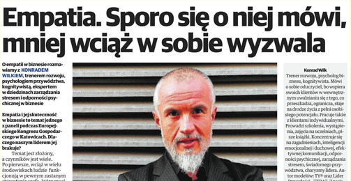 Konrad Wilk - twórca i trener AKADEMII ŚWIADOMEGO PRZYWÓDZTWA studiów podyplomowych w Wyższej Szkole Humanitas na całej stronie dodatku biznesowego Dziennika Zachodniego mówi o empatii i jej skuteczności w biznesie. To także temat jednego z paneli Europejskiego Kongresu Gospodarczego, który trwa do 15 maja.
