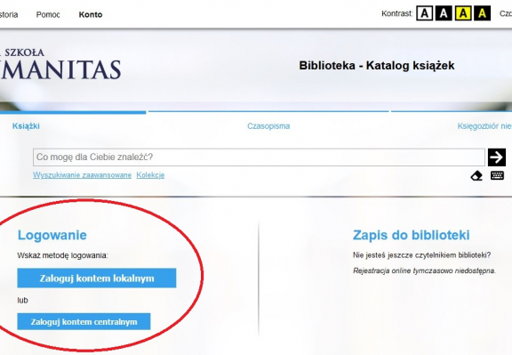Czytelnicy logują się przez opcję „Zaloguj kontem centralnym”. Po kliknięciu na przycisk należy zalogować się do swojego konta Office365. Dane do konta Ofice365 są wysyłane mailem, w którym nadawcą jest Wyższa Szkoła Humanitas. Po zalogowaniu pojawi się konto biblioteczne z danymi osobowymi i z polem do wyszukiwania książek.