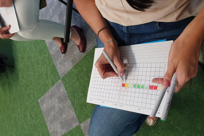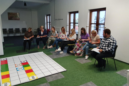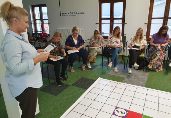 Podczas szkolenia nauczyciele mieli okazję zapoznać się z matą edukacyjną zaprojektowaną przez Akademię Humanitas. Agata Piątkowska koordynator projektów rozwojowych Akademii Humanitas i twórczyni maty edukacyjnej przedstawiła metodologię pracy z tym narzędziem, pozwalając nauczycielom „wejść w buty” swoich uczniów i doświadczyć praktycznych zadań. Dzięki temu nauczyciele będą mogli w pełni wykorzystać potencjał maty podczas zajęć z uczniami.