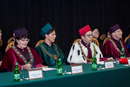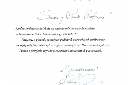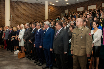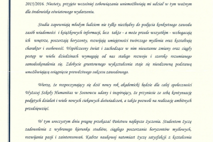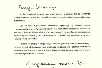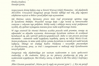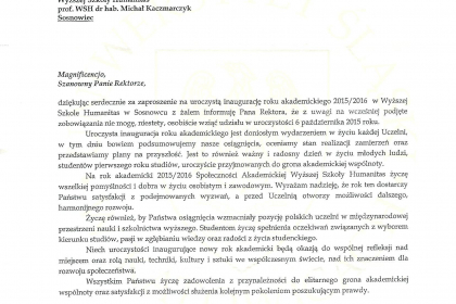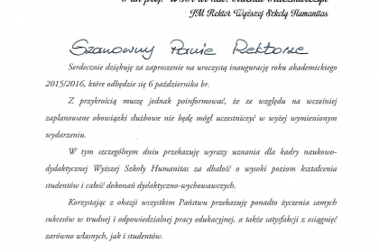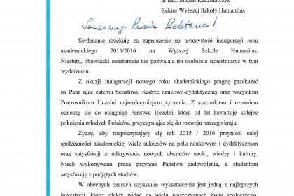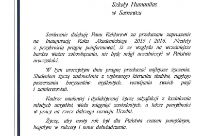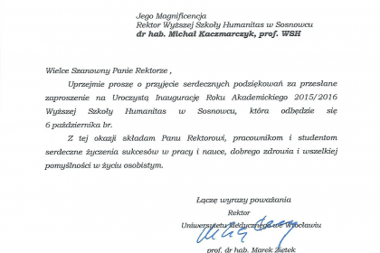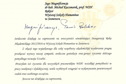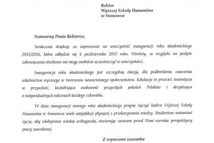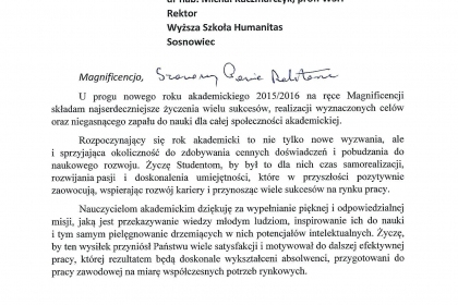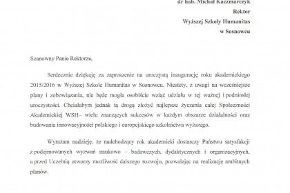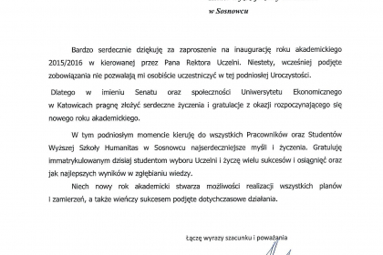 Rektor wymienił także najważniejsze osiągnięcia i wydarzenia zrealizowane przez uczelnię w minionym roku akademickim, zaś listy od Premier Ewy Kopacz oraz Minister Nauki i Szkolnictwa Wyższego, prof. Leny Kolarskiej-Bobińskiej odczytał dr Mariusz Lekston, który z dniem 1 października 2015 r. objął funkcję prorektora WSH ds. organizacyjno-prawnych i polityki kadrowej. Gratulacje nadesłali także samorządowcy, posłowie, przedstawiciele władz innych uczelni, dyrektorzy szkół, prezes Regionalnej Izby Gospodarczej oraz Komendant Śląskiej Komendy Wojewódzkiej Policji w Katowicach.